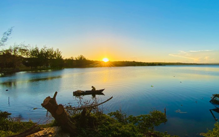 Bàu Sen được bao quanh bởi những triền cát trắng với cái nắng, cái gió được thiên nhiên ban tặng khiến cho hồ đẹp đến tuyệt vời. Từ trên đồi cát nhìn xuống hồ phẳng lặng tựa gương óng ánh sen hồng, xa xa những đồi cát sẫm màu nhấp nhô lên xuống khiến du khách không khỏi trầm trồ, thán phục.