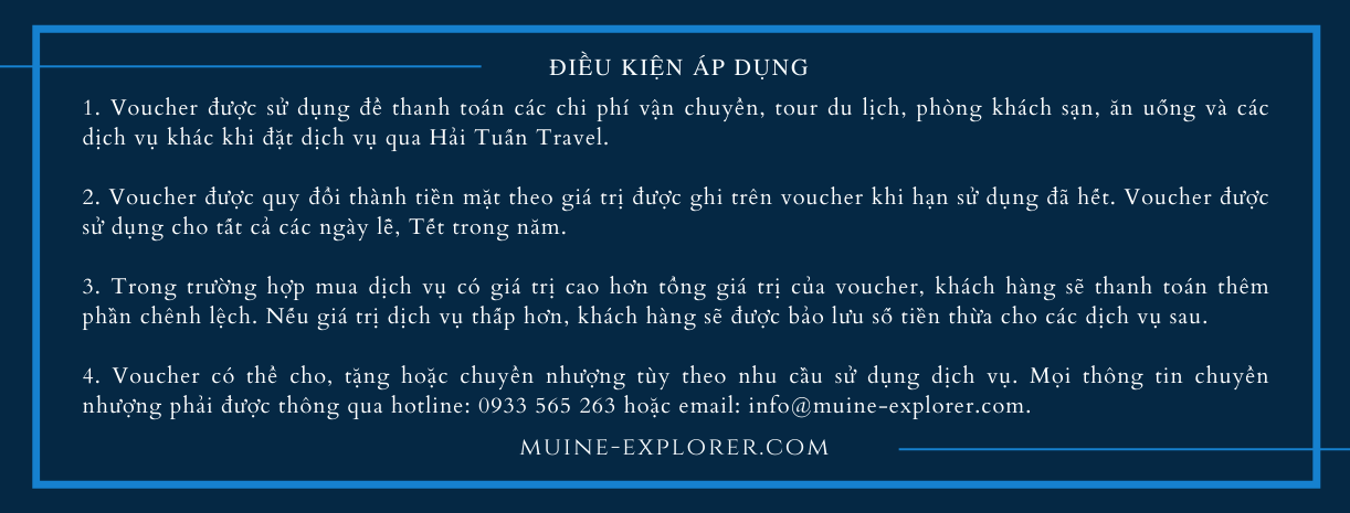 Lưu ý: Công ty Hải Tuấn không phân phối voucher cho các đại lý. Vui lòng liên hệ Mr Tuấn 0933 565 263 hoặc đăng ký qua website: muine-explorer.com