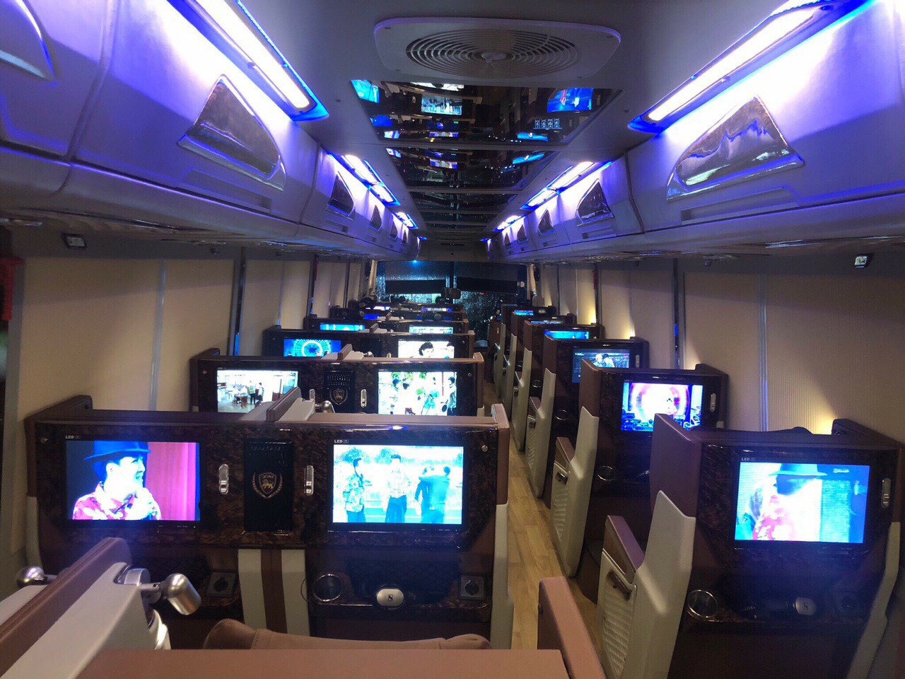 Bạn không cần lo lắng vì không có mạng, wifi để cập nhật thông tin nhé, đầy đủ cho bạn hơn nữa wifi trên xe có tốc độ nhanh nên bạn thoải mái cày những phim nặng.Mỗi chiếc ghế sẽ có cổng USB để cắm sạc dễ dàng, tránh điện thoại hết pin khi bạn vừa đến nơi. Bên cạnh đó, xe còn được trang bị tủ lạnh để hành khách có thể ướp lạnh thức uống, giải khát tốt hơn. Mỗi bạn đều được tặng 1 chai nước và 1 khăn lạnh nên cứ yên tâm nhé. Dàn máy giải trí cũng rất “oách” với Tivi và loa sony cho âm thanh sống động, hình ảnh sắc nét để bạn xem phim, xem hài… giải trí thỏa thích khi di chuyển trên xe.