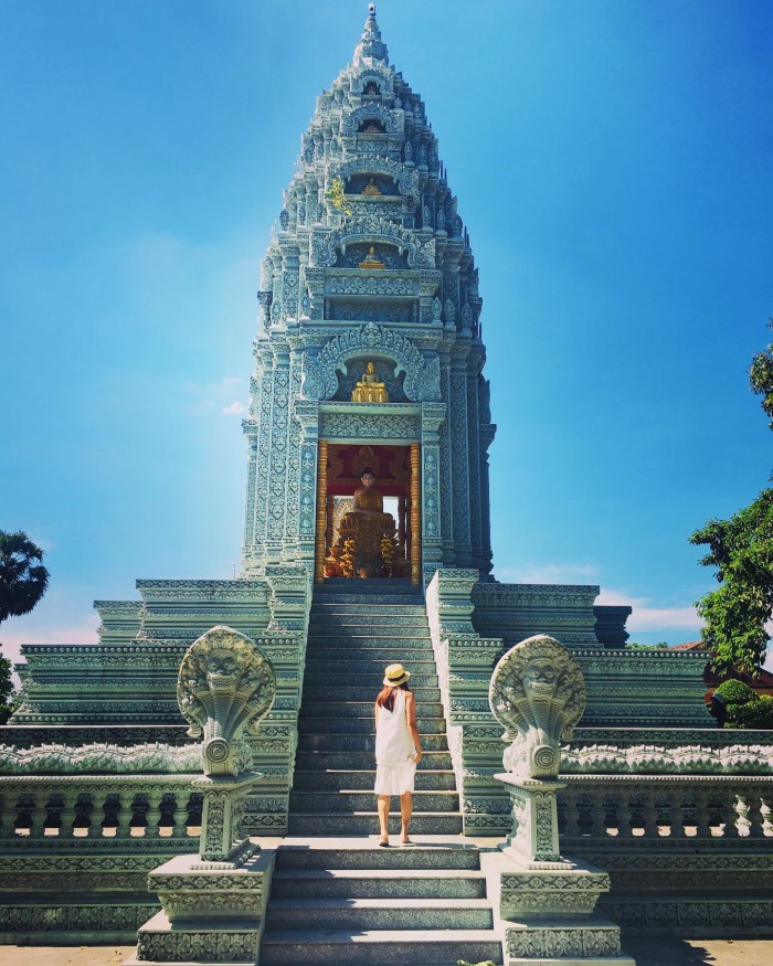 Điều khiến chùa Som Rong Sóc Trăng trở thành nơi thu hút giới trẻ chính là ngôi bảo tháp hoành tráng trong khuôn viên của Chùa. Kiến trúc này được sơn màu xám, vừa toát lên vẻ hiện đại lại vừa uy nghi, cổ kính như những kiến trúc bằng đá nguyên khối.