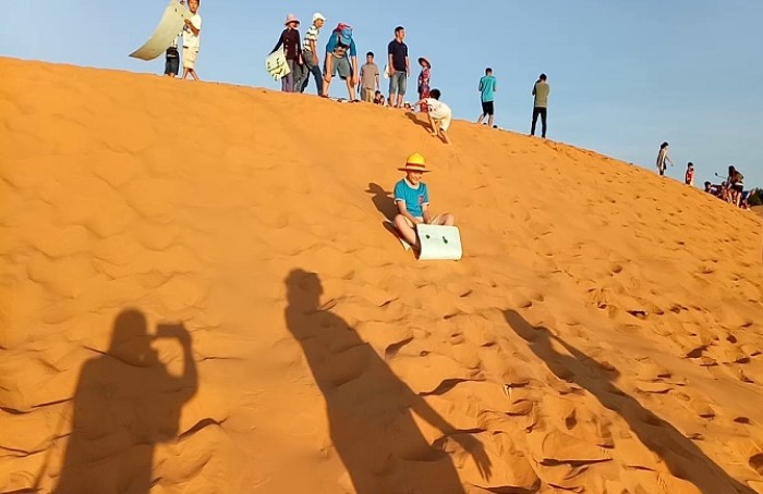 Ngồi trên chiếc tấm ván lướt bằng nhựa, thả mình theo dòng cát từ trên đỉnh xuống, thỏa sức la hét vui đùa sẽ khiến muộn phiền căng thẳng của bạn tan biến hết.