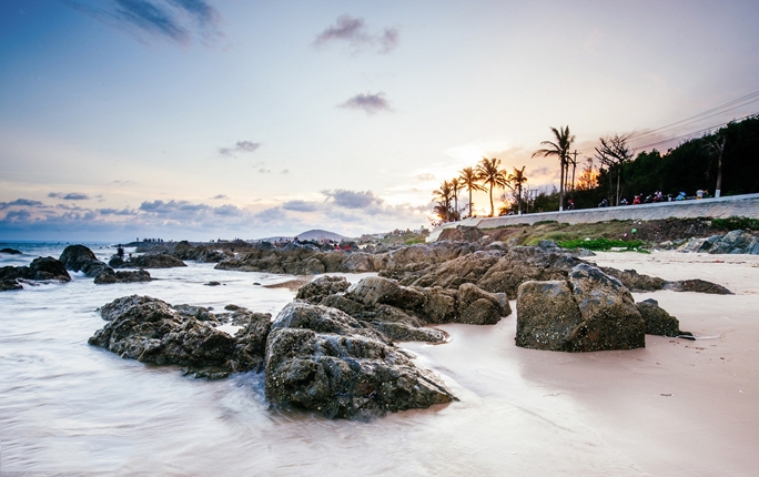 Ong Dia rock beach is located by Nguyen Dinh Chieu street, half way between Mui Ne – capital of resort and Phan Thiet city. It’s a beautiful seaside with some rocks, concrete breakwater, a long sidewalk with romantic coconut trees and benches for visitors. You will easily recognize this spacious beach side when you get there.