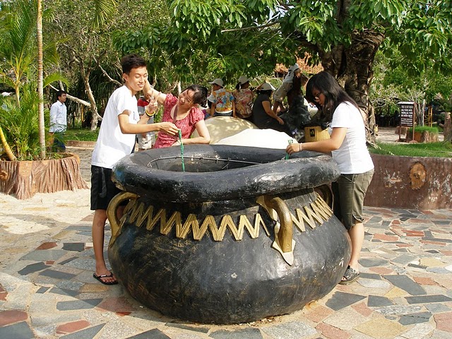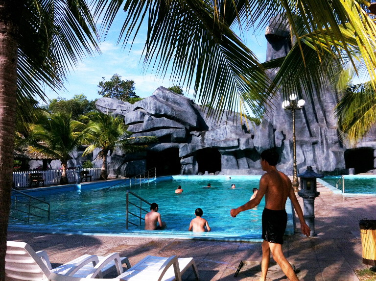 It takes you 2 hours by coach to reach Binh Chau hot spring resort in Ba Ria-Vung Tau. A large boiling lake with hot mineral mud at 70 exposed points is located at a wide cajuput forest. The permanent temperature is ranging from 40oC – 82oC. Your are welcome to enjoy a cool package service in this resort: foot soaking in 37oC Hue- Sai Gon- Ha Noi hot stream, hot mineral water bathing in Mo stream and hot fine mud bathing. Go to open air well of 82oC to try egg boiling within 10 minutes.