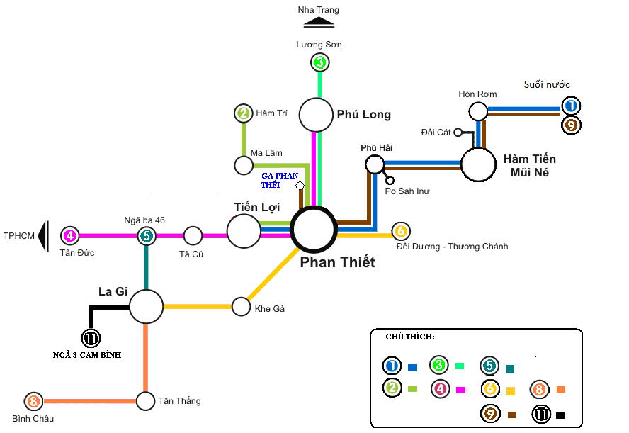 Route: Tien Loi - Tran Quy Cap - Tran Hung Dao - Nguyen Tat Thanh - Thu Khoa Huan - DT 716 - Mui Ne - Hon Rom - Long Son - Suoi Nuoc (and vice versa)