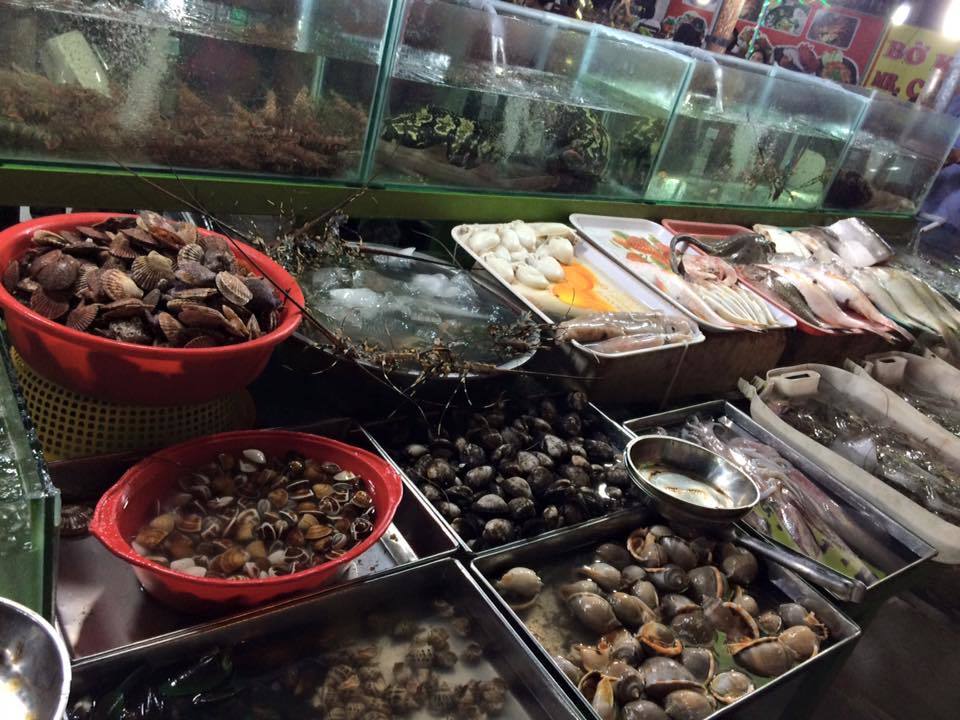 Seafood here is placed on the Styrofoam box or in a water tank with all kinds of species, from the familiar dishes as clams, oysters, shells, squid, shrim, fish ... to the seafood more particularly as lobsters.