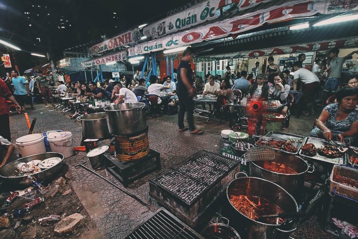 Vinh Khanh Food Street, District 4 is lined with restaurants serving all types of fresh, tasty seafood, BBQ, hot pot.