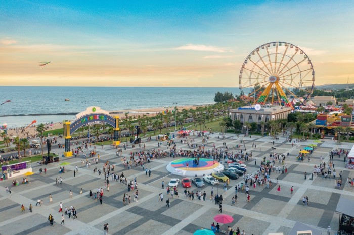 Movenpick resort tọa lạc ngay trước bãi biển Bikini Beach, bên phải resort là dãy shophouse của các thương hiệu nổi tiếng thế giới và khu trò chơi Circus Land cùng công viên nước Wonderland Water Park.