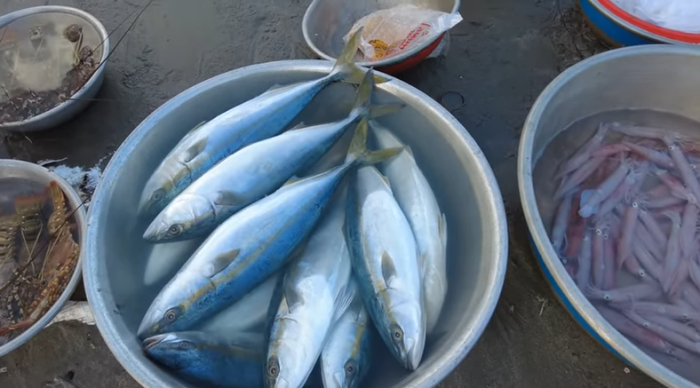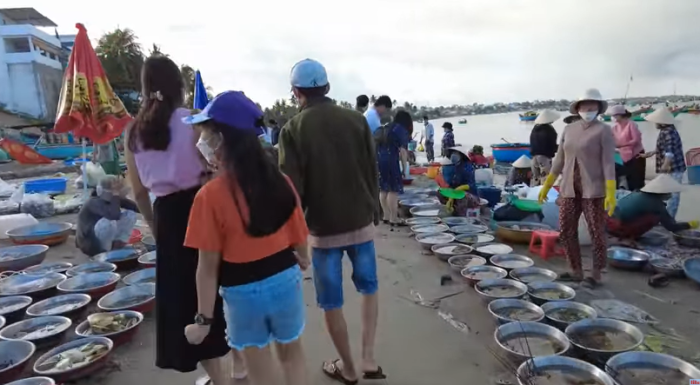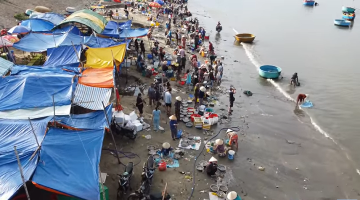 Bắt đầu từ 5h30 đến 6h sáng trở đi, những chiếc thuyền, chiếc thúng ngoài khơi xa lần lượt mang theo một nguồn hải sản lớn vào bờ. Những ngư dân đi biển nhảy xuống kéo thuyền thúng, kéo hết những gì đánh bắt được đổ ra tấm bạt ni-lon trải trên cát.