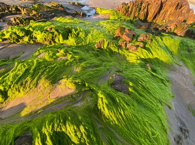 Thời gian giữa khuya nước thủy triều nơi đây sẽ rút xuống (nước rồng) và cũng là lúc bình minh ló dạng thì các bãi đá được nhô lên và rêu xanh phủ đầy các phiến đá tạo ra một khung cảnh thiên nhiên tuyệt đẹp.