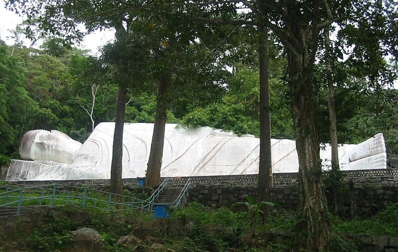 Pho tượng khổng lồ "Thích Ca nhập niết bàn" nằm ở vị trí cao nhất cách chùa khoảng 100m. Bằng tài nghệ, kỹ thuật điêu khắc và lòng sùng kính, các nghệ nhân đã tạo nên pho tượng hiếm có trong lịch sử Phật giáo Việt Nam. Tác phẩm do kỹ sư Trương Đình Ý chủ trì thực hiện vào năm 1962. Tượng Phật Thích Ca trong tư thế nằm nghiêng, đầu gối lên tay phải, 2 chân duỗi thẳng, mặt quay về hướng tây nam, lưng dựa vào vách núi. Pho tượng dài 49m, cao 6m và nặng hàng trăm tấn. Cách pho tượng chừng 50m là nhóm tam thể phật trong tư thế đứng: tượng A Di Đà, tượng Quan Âm Bồ Tát, tượng Đại Thế Chí. Cả 3 pho tượng có chiều cao khoảng 7m nét mặt hiền hòa đang nhìn bao quát thế gian.
