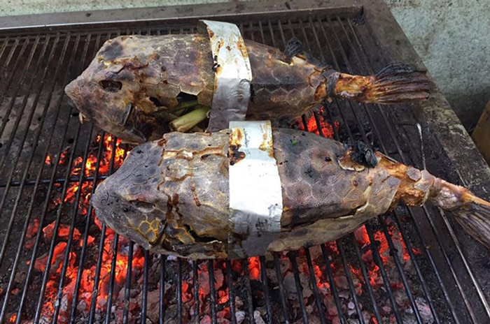 Cá bò hòm thuộc giống cá nóc, thịt trắng phau, có sớ dọc và dai giống hệt thịt gà. Cá tươi được làm sạch ruột, để ráo sau đó tẩm ướp gia vị, đặc biệt là cho sả và ớt vào trong bụng để khi nướng lên tạo mùi thơm cho thịt cá. Bạn có thể ăn không hoặc cuốn bánh tráng tùy thích. Đây là một trong những món ăn đặc sản ở LaGi rất ngon mà bạn nên thử khi ghé thăm nơi này.