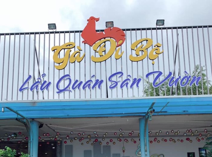 Quán Gà đi bộ - Lẩu quán sân vườn nổi tiếng với đặc sản Lagi gà ta đi bộ, thịt ngọt và dai vừa phải, hương vị đậm đà. Vì thế nên dù nằm trong hẻm thì quán vẫn rất đông khách, được nhiều người dân địa phương và khách du lịch biết đến. Ưu điểm của quán là không gian khá rộng rãi, bàn ghế được sắp ngăn nắp, sạch sẽ, phục vụ nhanh nhẹn, nhiệt tình.