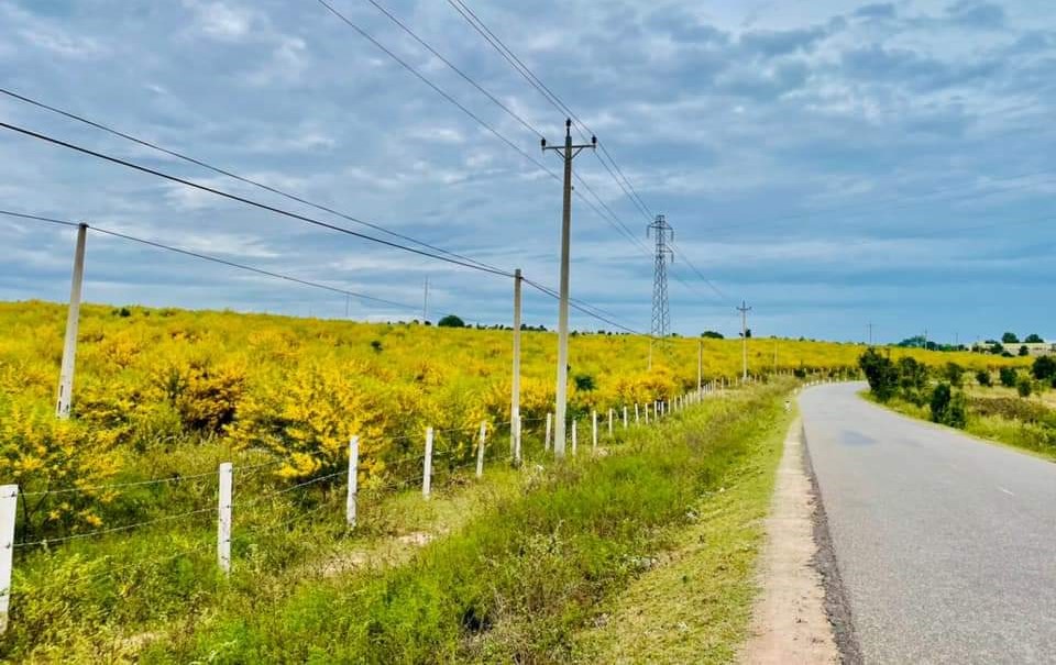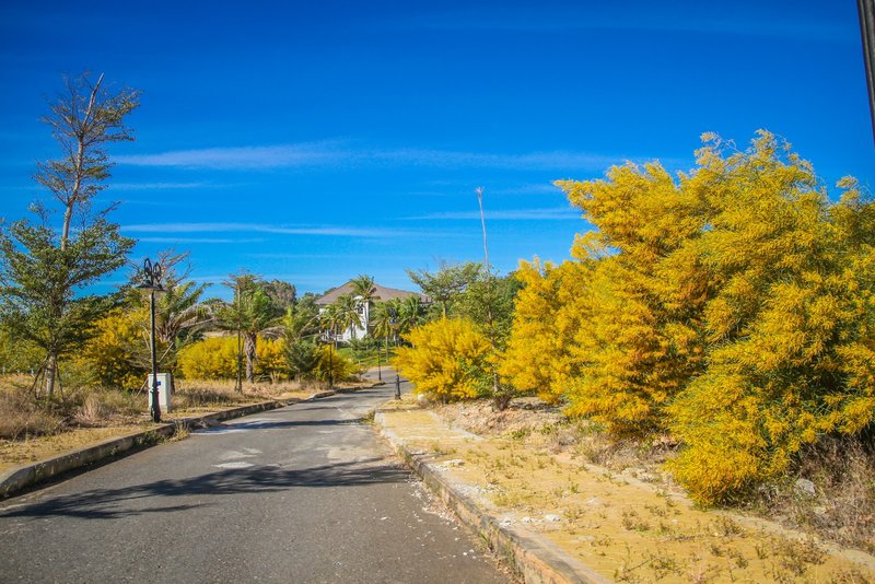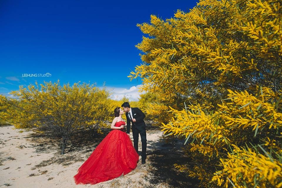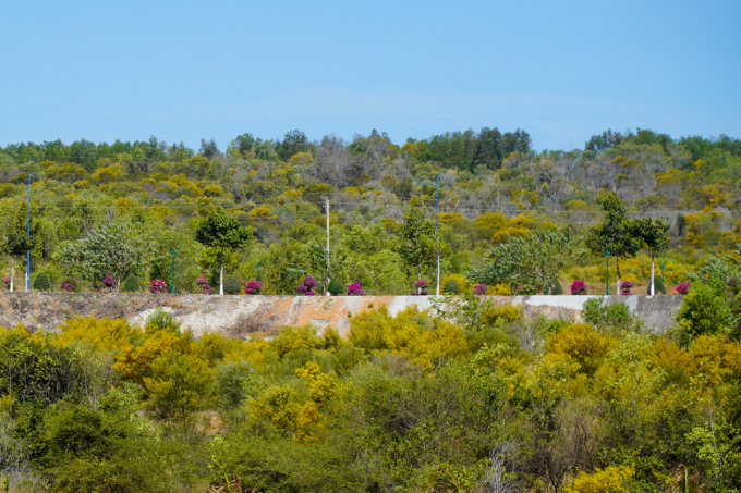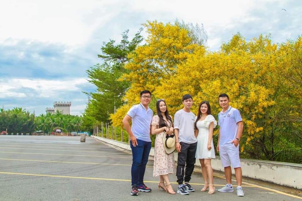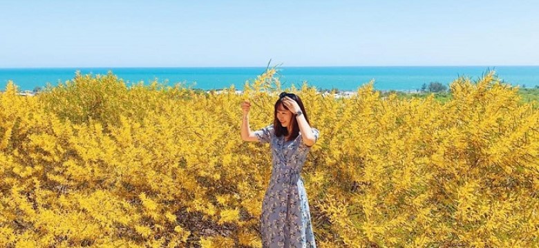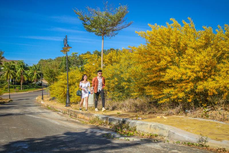 Rừng keo lá tràm nở hoa làm bừng sáng cả một góc trời, những chùm hoa lá tràm như một điểm nhấn vàng tươi trên đồi cát trắng, phía xa còn có các căn biệt thự và bãi cỏ xanh khiến ai ai cũng muốn ngắm nhìn, chắc chắn sẽ là một background chụp hình không thể nào hoàn hảo hơn cho bạn.