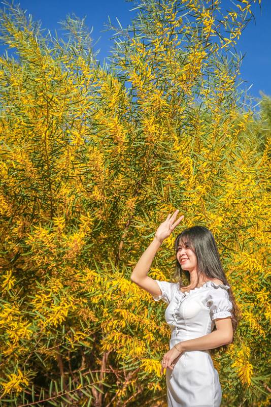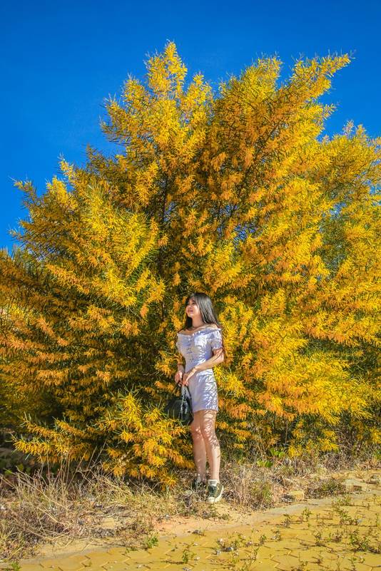 Về tông màu chủ đạo của rừng keo tràm hoa vàng thì chắc chắn là màu vàng rồi, chính vì thế mà bạn nên diện các trang phục có thể nổi bật trên nền vàng như màu trắng, đây có lẽ là màu phù hợp nhất, hoặc có thể kết hợp với các màu khác như đen, nâu nhạt hoặc đỏ thì cũng sẽ khá phù hợp.