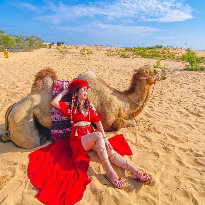 - Để chụp được những tấm ảnh đẹp bên chú lạc đà thì các bạn nên mặc những bộ đầm rộng, màu sắc tươi, hoặc màu trắng thì sẽ rất nổi bật. Nếu bạn không mang theo nhiều trang phục khi đi du lịch thì đến Mũi Né có thể liên hệ Ms Bình Yên để thuê đồ, tại đây cho thuê nhiều trang phục chụp ảnh sống ảo rất nổi bật.