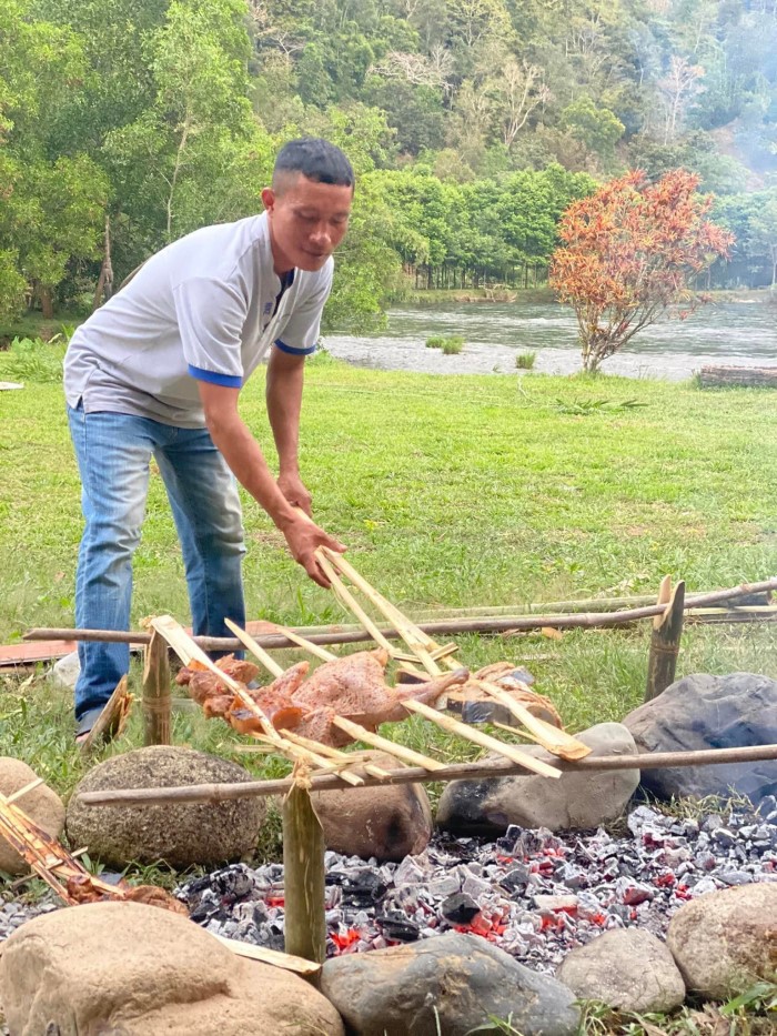 Món chính gồm: Cơm lam ống tre, nai xào rau rừng (lá bép), gà nướng