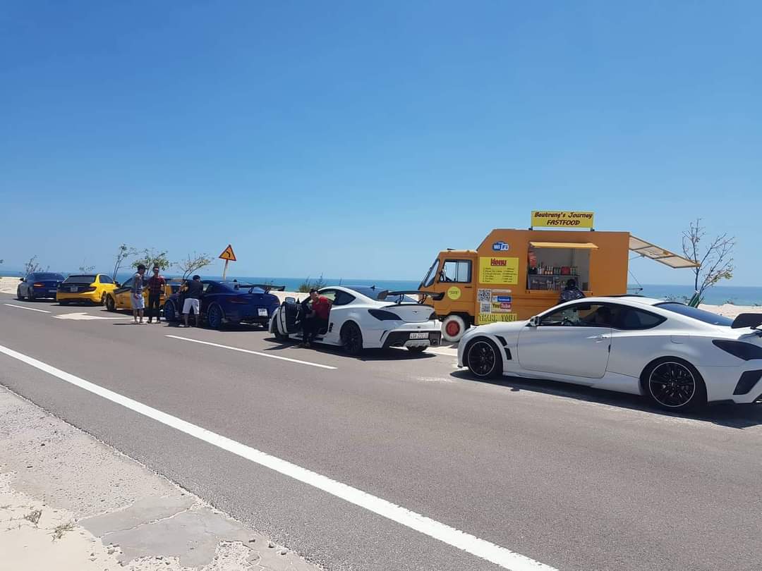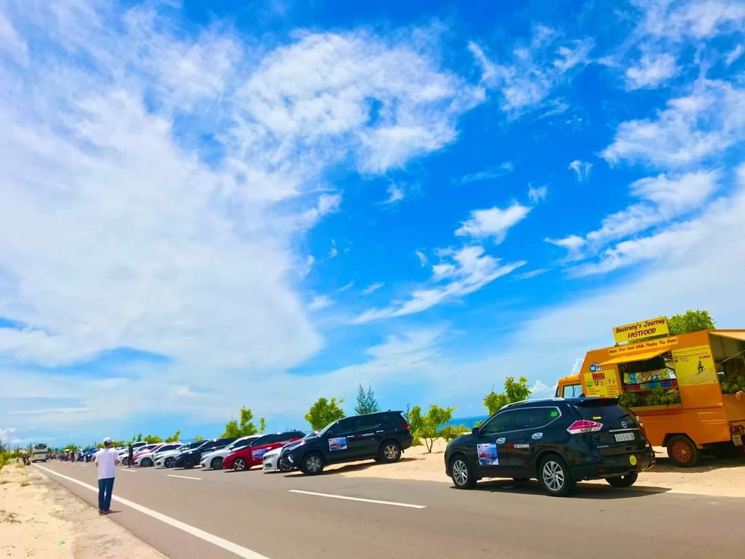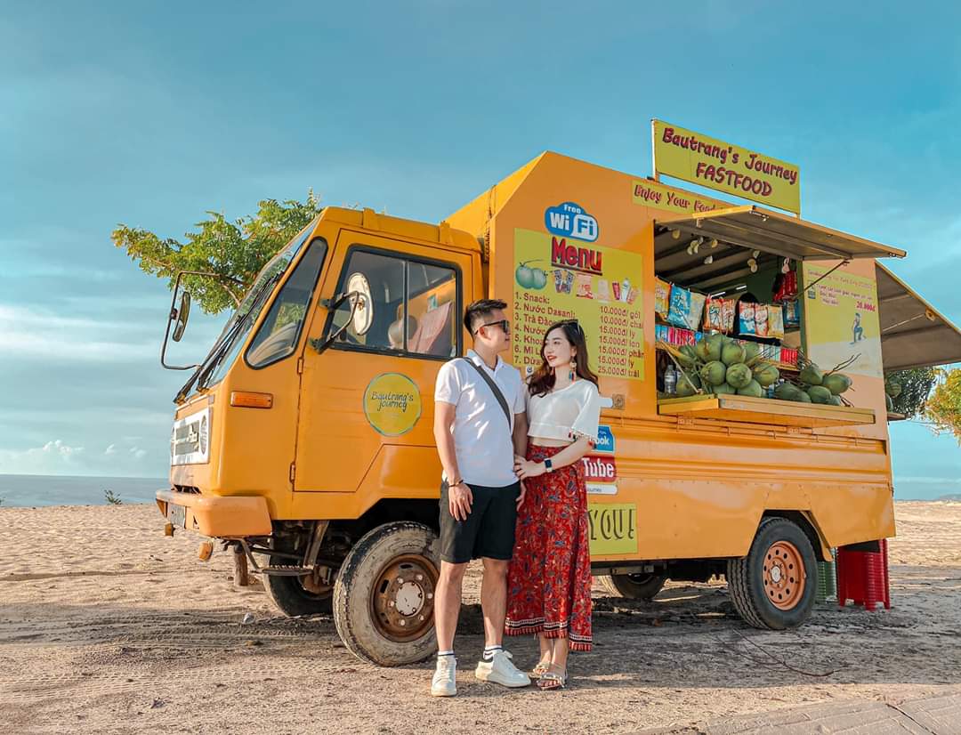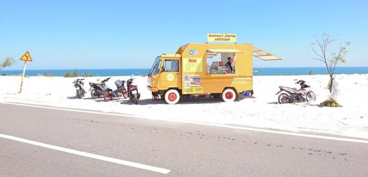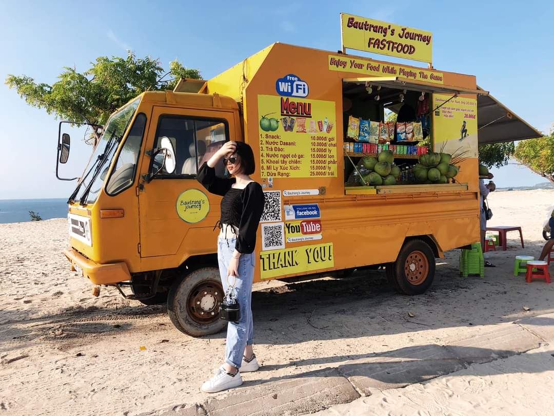 Xen lẫn giữa màu trắng tinh khôi của đồi cát là hình ảnh chiếc xe màu vàng cam Bàu Trắng Journey nổi bật, hút mắt. Đây là chiếc xe bán nước giải khát nằm trên cung đường Bàu Trắng, bạn có thể mua nước mang đi hoặc ngồi lại bên những chiếc ghế cốc uống nước dừa tươi dừa Rạng Mũi Né mát ngọt.
