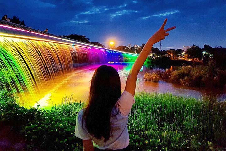 Điều cuốn hút mãnh liệt hơn nữa đó chính là vòi phun nước với ánh sáng cầu vồng thay đổi liên tục tạo nên khung cảnh lãng mạn đầy nghệ thuật.