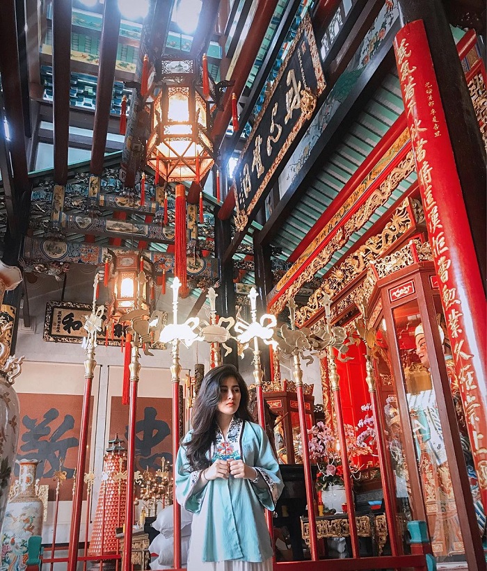 Những ngày nắng đẹp, các bạn trẻ khắp nơi lại đổ về chùa Bà Thiên Hậu để chụp ảnh. Mang nét kiến trúc cổ kính của người Hoa với lối đi bằng đá, các họa tiết, cột gỗ được điêu khắc cầu kỳ, chùa bà Thiên Hậu khi lên ảnh cực kỳ lung linh, ảo diệu. Chính vì vậy, mà nhiều người thường đến đây để chụp hình với trang phục truyền thống.