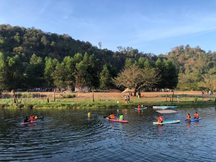 Tại La Ngâu Rock Stream homestay & camp có cung cấp các dịch vụ liên quan đến camping như cho thuê lều, bungalow, dịch vụ thuyền Kayak, SUP để chèo trên dòng suối in bóng mây trời chụp hình đẹp sống ảo.