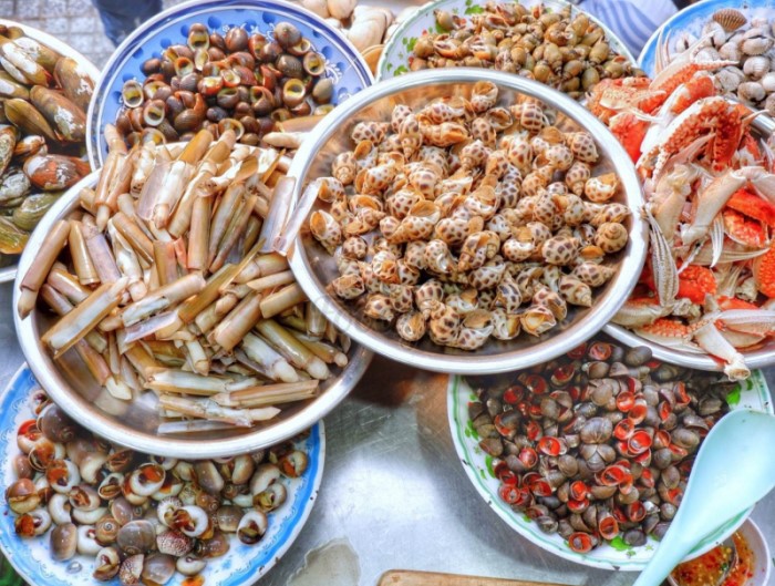 Kể qua một vài món ốc ở thành phố biển như ốc voi, ốc mỡ, ốc bông, ốc hương, ốc móng tay, ốc đá,… Ốc có thể chế biến thành nước sốt me, hấp sả, xào mỡ, cháy tỏi hay nướng tiêu xanh… đều được.
