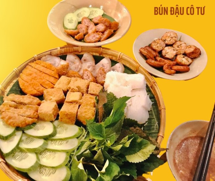 Đúng như tên gọi thân thuộc và bình dị, Quán Bún Đậu Cô Tư mang hương vị dân dã, đậm chất Bắc Bộ. Đến với Bún Đậu Cô Tư, bạn sẽ được thưởng thức món Bún Đậu ngon tuyệt với đầy đủ các nguyên liệu như bún, rau ăn kèm với đậu phụ rán các loại, tóp mỡ, bánh đa cua thơm phức với những miếng thịt chân giò luộc vừa chín tới chấm với mắm tôm mặn ngọt, cay cay, ăn một lần bạn sẽ nhớ mãi.