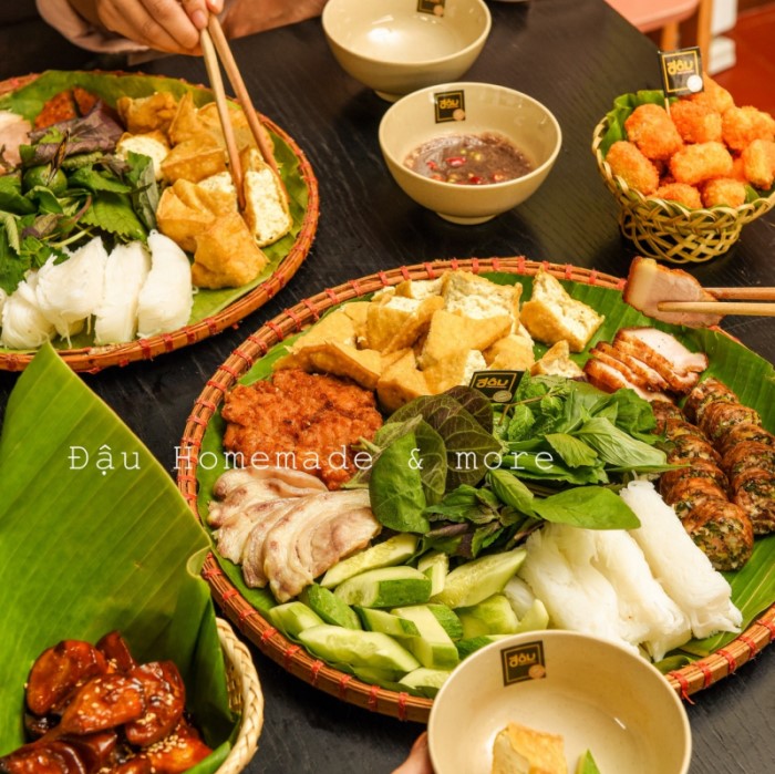 Đậu Homemade mang đến hơn 30 món ngon đậm đà phong vị Bắc Bộ như bún đậu mắm tôm, bún sườn, ốc nhồi thịt, nem tai trộn thính, lẩu riêu cua bắp bò... mức giá không bình dân nhưng rất phù hợp với chất lượng. Quán có các món lẻ và còn xây dựng cả combo, các set ăn kết hợp nhiều món từ khai vị, ăn vặt đến ăn no để khách hàng lựa chọn, vừa thưởng thức được nhiều hương vị vừa không cần chi quá nhiều tiền để trải nghiệm. Hơn nữa, món ăn còn được chăm chút vẻ ngoài, các vật dụng dùng để trang trí cũng rất ra dáng "Hà Nội" team mê chụp ảnh sẽ ưng ngay khi món đến bàn.