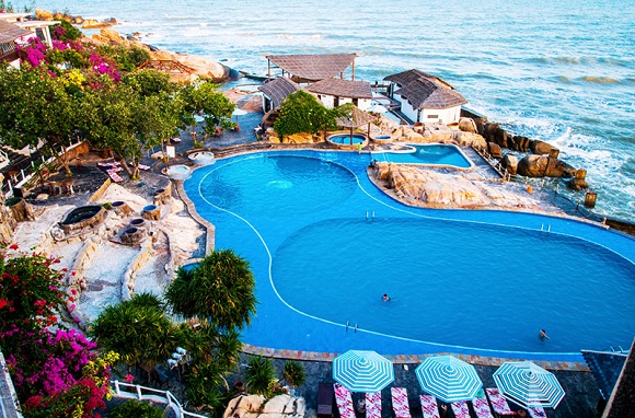 - Rock Water Bay Resort tọa lạc ngay Vịnh đá nhảy biển Kê Gà Hàm Thuận Nam có view check in sống ảo cực đẹp với hồ bơi vô cực bằng nước biển, hồ bơi được tạo thành từ những mõm đá tự nhiên nhô ra biển.