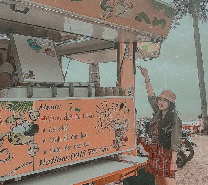 Ăn hải sản nướng, bánh tráng mắm ruốc, trái cây chấm mắm ruốc là những món đặc sản phổ biến được bán trên các xe đẩy dưới các tán dừa ngay đầu đường Nguyễn Đình Chiểu dọc bờ biển này. Bạn có thể ngồi ghế vừa ăn, vừa ngắm biển tận hưởng những làn gió biển mát rượi. Hoặc cùng nhâm nhi món kem dừa tươi mát lạnh rất ngon.