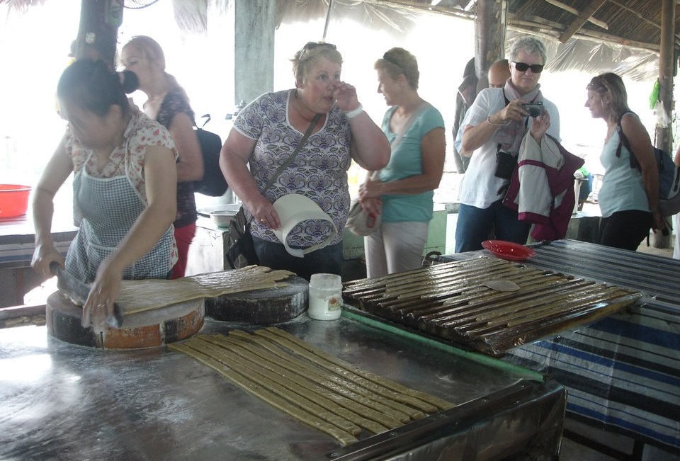 - Trở ra thuyền lớn, xuôi theo dòng Sông Tiền, thuyền sẽ đưa quý khách đến tỉnh Bến Tre để tham quan lò kẹo dừa đặc sản của Bến Tre, lò bánh tráng ở xã Tân Thạch.
