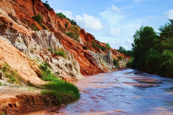 14h00 Đến Mũi Né tham quan Suối Tiên. Đây là dòng suối nhỏ, chạy xuyên qua sườn đồi cát đỏ. Hai bên vách suối phủ đầy cát vàng và cát đỏ.
