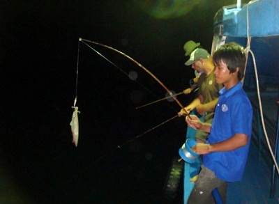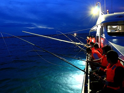 Đó chính là lúc để trải nghiệm những giây phút vừa thư giãn vừa thú vị cùng thủy thủ đoàn với hoạt động câu mực đêm. Sẽ không gì bằng khi chính tay bạn câu được những con mực đang săn mồi dưới biển hay vớt được những chú cá kiếm đang nổi mình trên mặt nước ngoài khơi. Chiến lợi phẩm là mực câu hay cá vớt được sẽ được phục vụ ngay trên tàu.