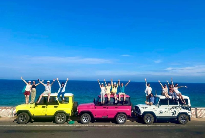 – Tạo dáng ngồi trên những chiếc xe Jeep màu sắc nổi bật bên cung đường biển cuốn hút.